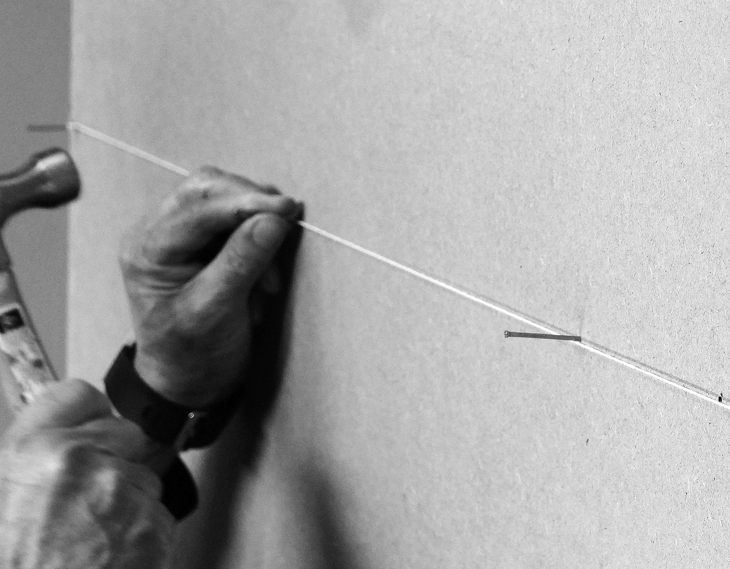 Tip 2: To help ensure an absolute straight starter line with the first plank, we recommend you tap 1 1⁄2" finish nails halfway into the wall along the starting line at every 12". The protruding nails will help position the starter planks along the starting line before they are adhered to the wall. This procedure will not be possible when installing over a block wall. Use extra caution to ensure your first row is straight if you are not able to use nails as a guide.